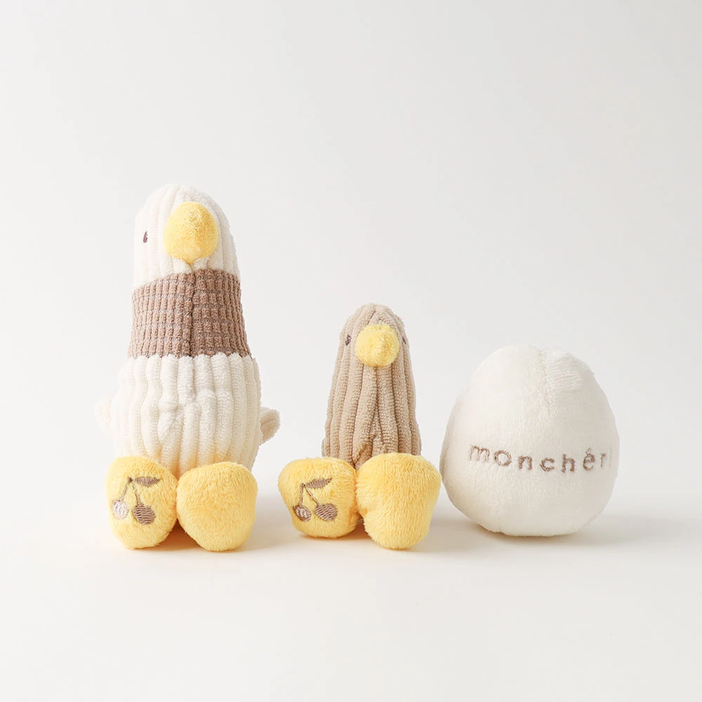 親あひる:約20cm、子あひる:約12cmのサイズで、小型犬から中型犬まで幅広くお楽しみいただけます。特に子犬期から成犬期にかけて、長く愛用していただける設計となっています。
