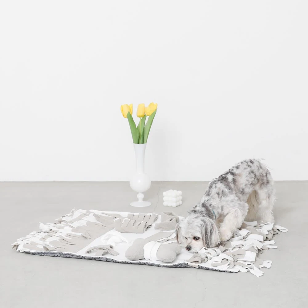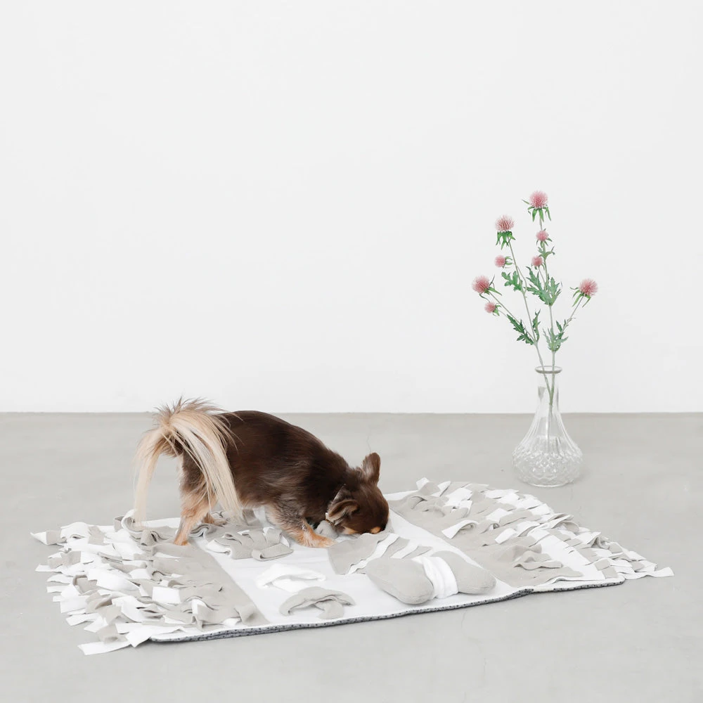 当マットは犬の行動学と認知科学の研究に基づいて開発されました。バイカラー(二色)デザインは視覚的な魅力だけでなく、異なる色の領域が犬の探索意欲を高める効果があります。高密度のポリエステル素材を使用し、洗濯機での洗濯が可能なため、衛生面でも優れています。
