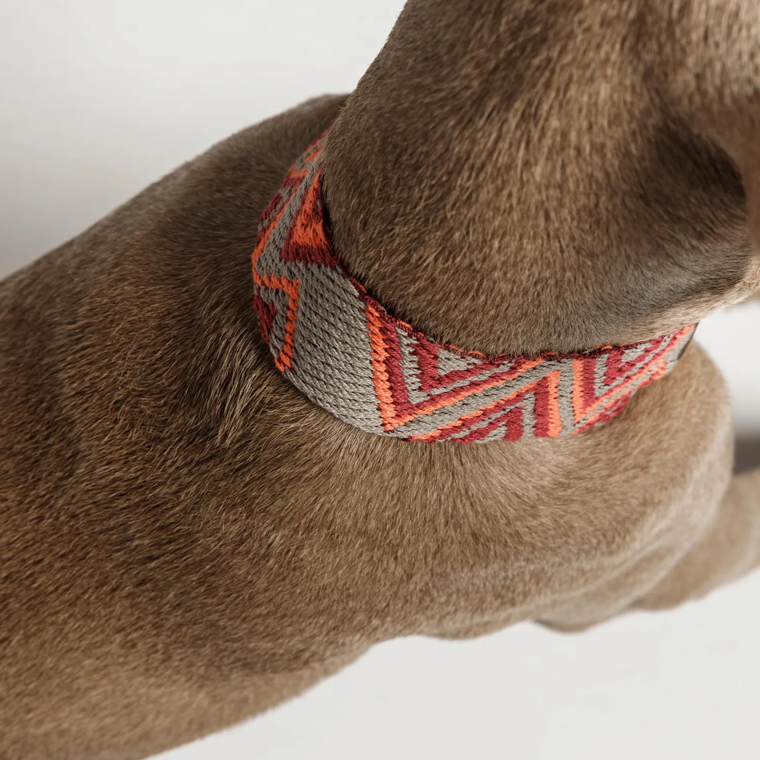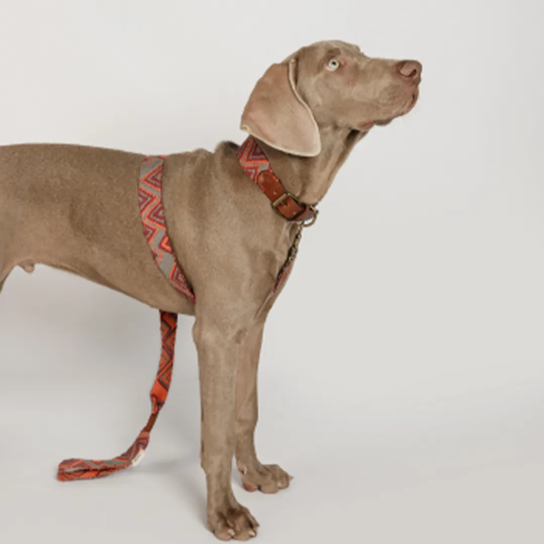 Pike=槍のことで、ランダムに配置された尖った三角の模様が特徴的なデザインです。グレー地に赤とオレンジの個性的な色合いは他にはないコレクションで、Coolな愛犬にピッタリ。